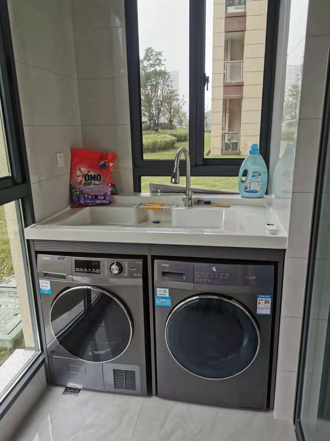 阳台主要是晾晒,下面放洗衣机和烘干机,上面是一体台面,方便清洁,也美观大方