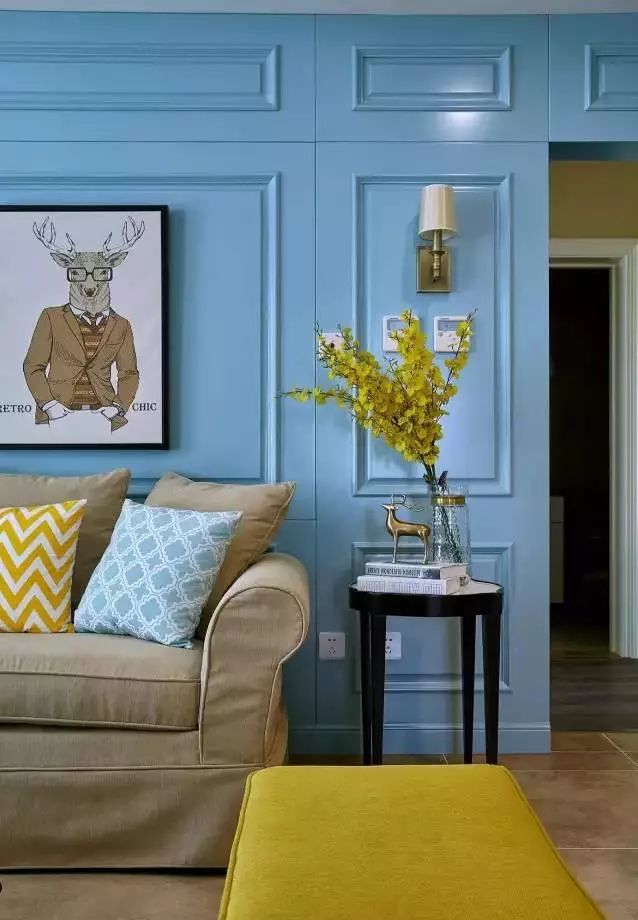 蓝色的造型墙,让屋内的气氛更加清爽。精致的壁灯和挂画也很好的装饰了墙壁。浅色的沙发搭配彩色的抱枕,实木的茶几和边几超级耐看,桌上放一瓶花,让客厅多了份生机盎然。