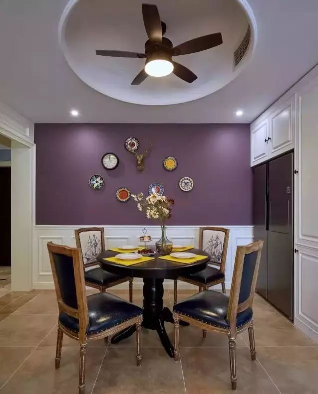餐厅与客厅相连,白色的护墙板上面是紫色的背景墙,上面挂满了各种装饰品,很是别致。小圆桌和圆形的吊顶,在搭配上这个复古的吊扇灯,整个空间都完美和谐。