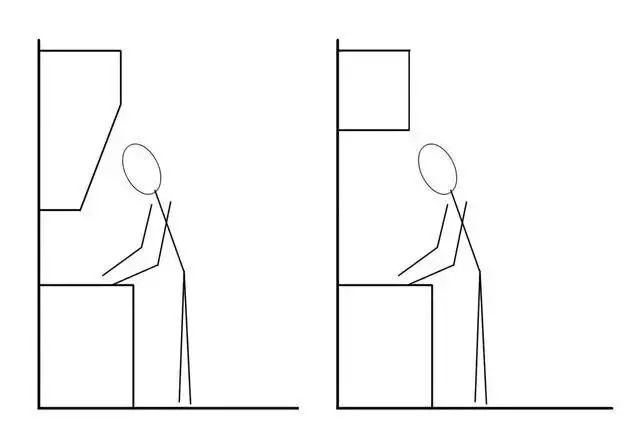 于是,有人便把厨房吊柜设计成倾斜式的了,就像一个直角梯形。除了和传统橱柜外形不太一样之外,柜门也不一样,倾斜式吊柜门几乎都是推拉门,而传统橱柜一般都是平开门。那么这样设计到底用意是什么?又到底好不好用呢?一起来看看下面的分析吧。