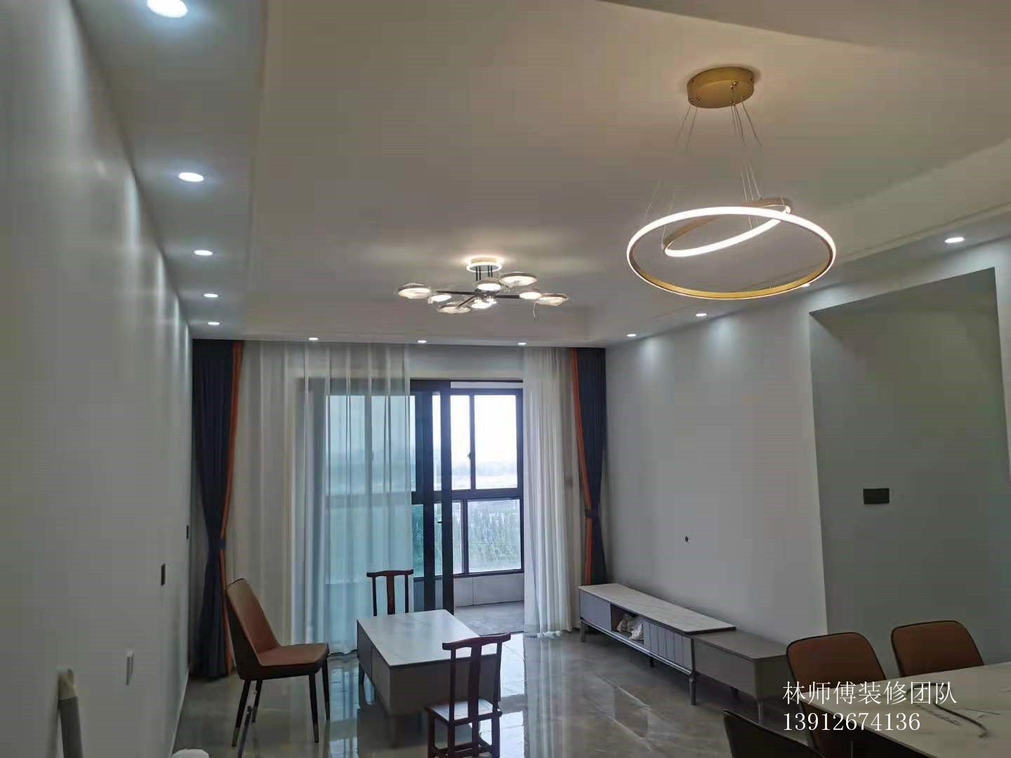 客厅,茶几和电视柜是配套的,整体性非常强,分子灯很有个性,吊灯周围的筒灯增加了客厅的浪漫氛围。