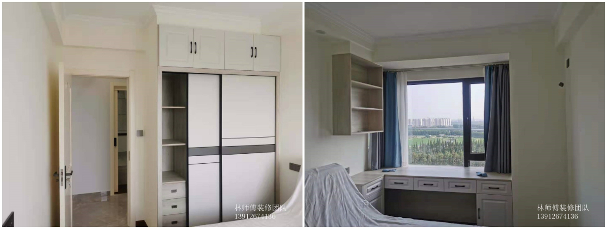 次卧,一边做了到顶的衣柜,增加收纳能力,另一边靠窗做了书桌,方便学习工作。书桌是L型的,延伸到床边,正好可以代替床头柜,上面是放开柜,可以收纳一些书,方便拿放。