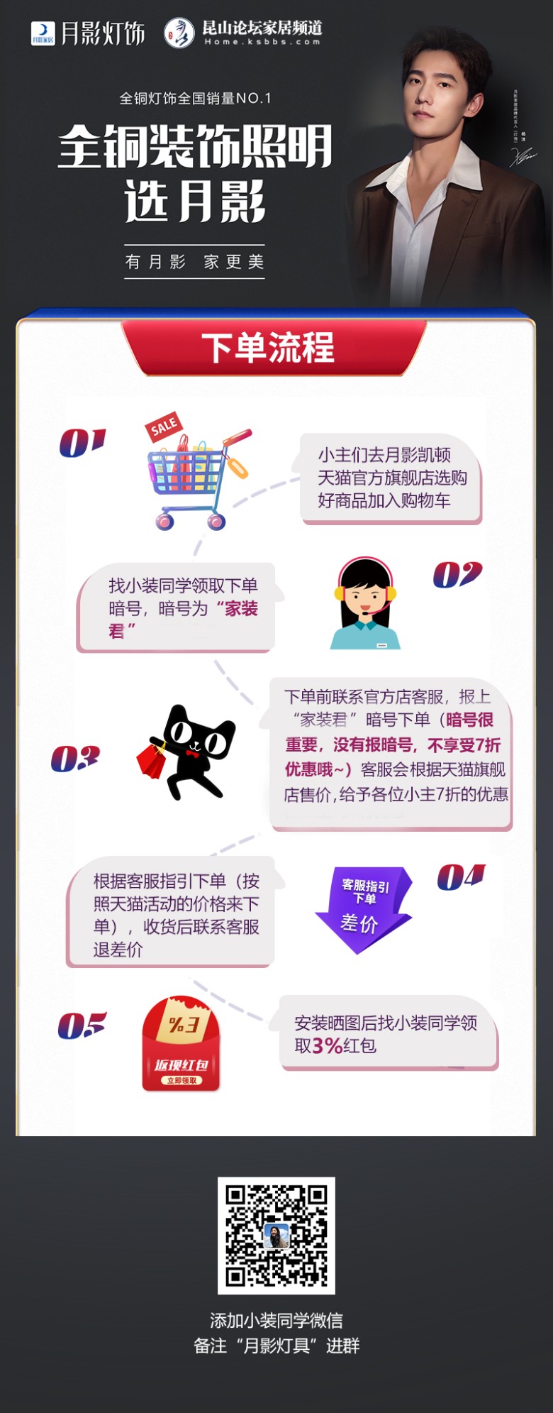 1、添加小装同学微信,备注“月影灯饰”客服会依次拉人入群,大家注意查看群消息,不要错了心仪产品的团购机会。