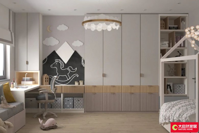 在橱柜的边上,还有一个非常有创意的木隔板,让儿童房充满童趣