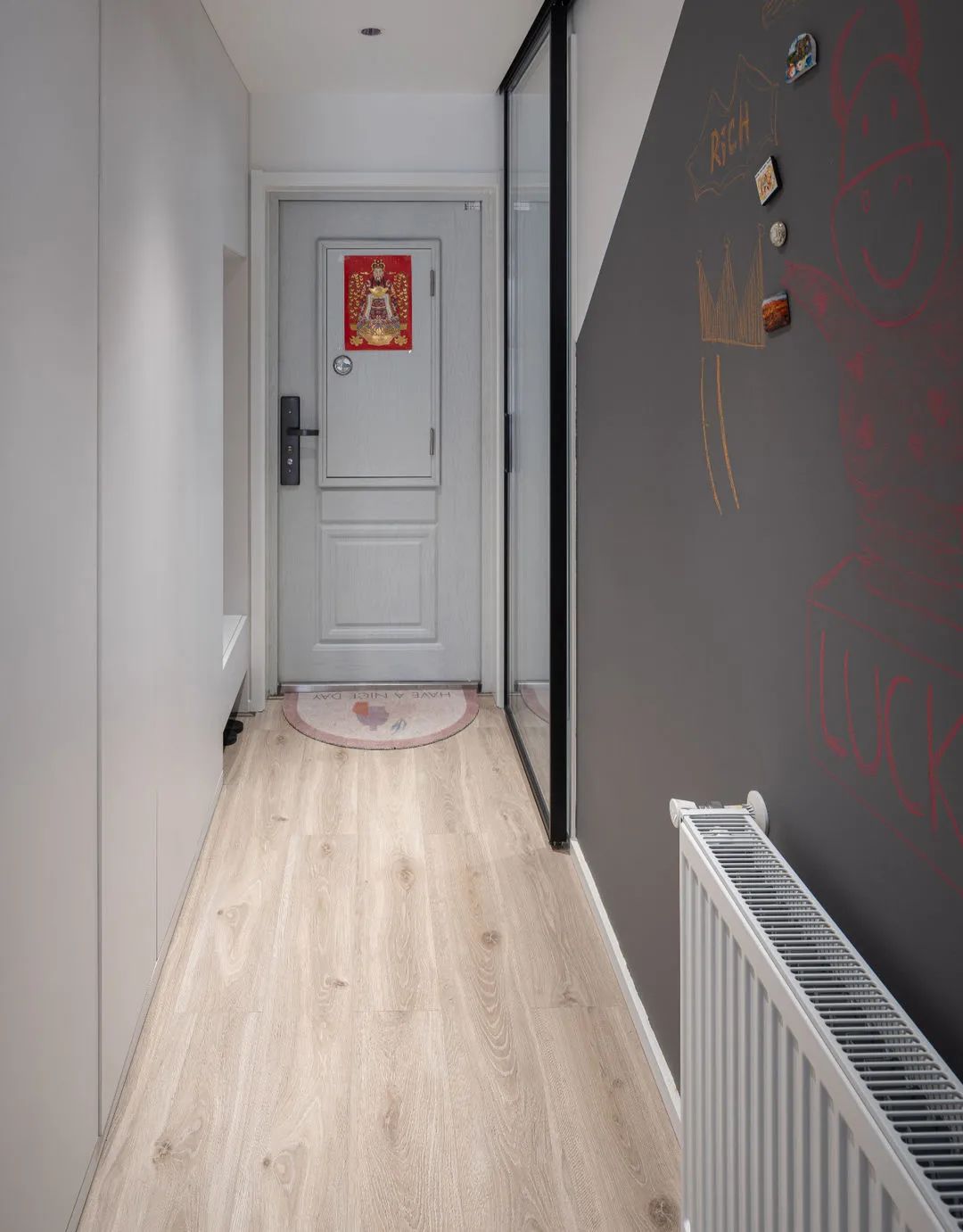 玄关属于狭长型,考虑到实用性和空间舒适度,定制了组合式柜子,鞋柜与储物柜结合,不仅提供了充足的收纳,还让换鞋变得轻松许多。柜子对立面是厨房和黑板墙,灵活的移门设计,作为玄关采光的补充,黑板墙让狭长的过道多了几分趣味性。