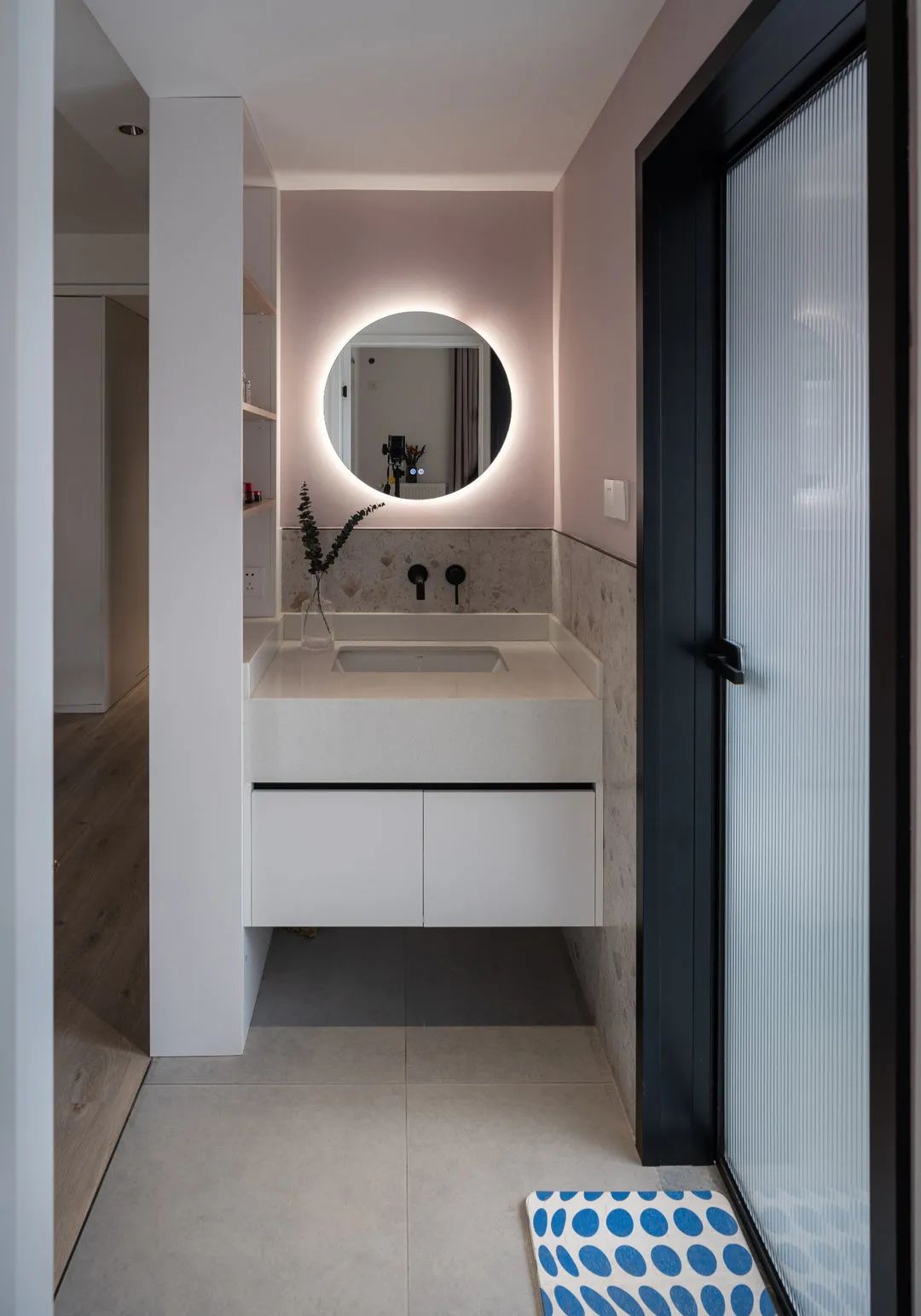 卫生间采用分离式设计,让日常使用更方便。干区隐藏在隔断柜后方,小巧而精致。由于台面空间有限,在左侧墙面做了收纳。带灯带的圆镜子,满满的少女心。