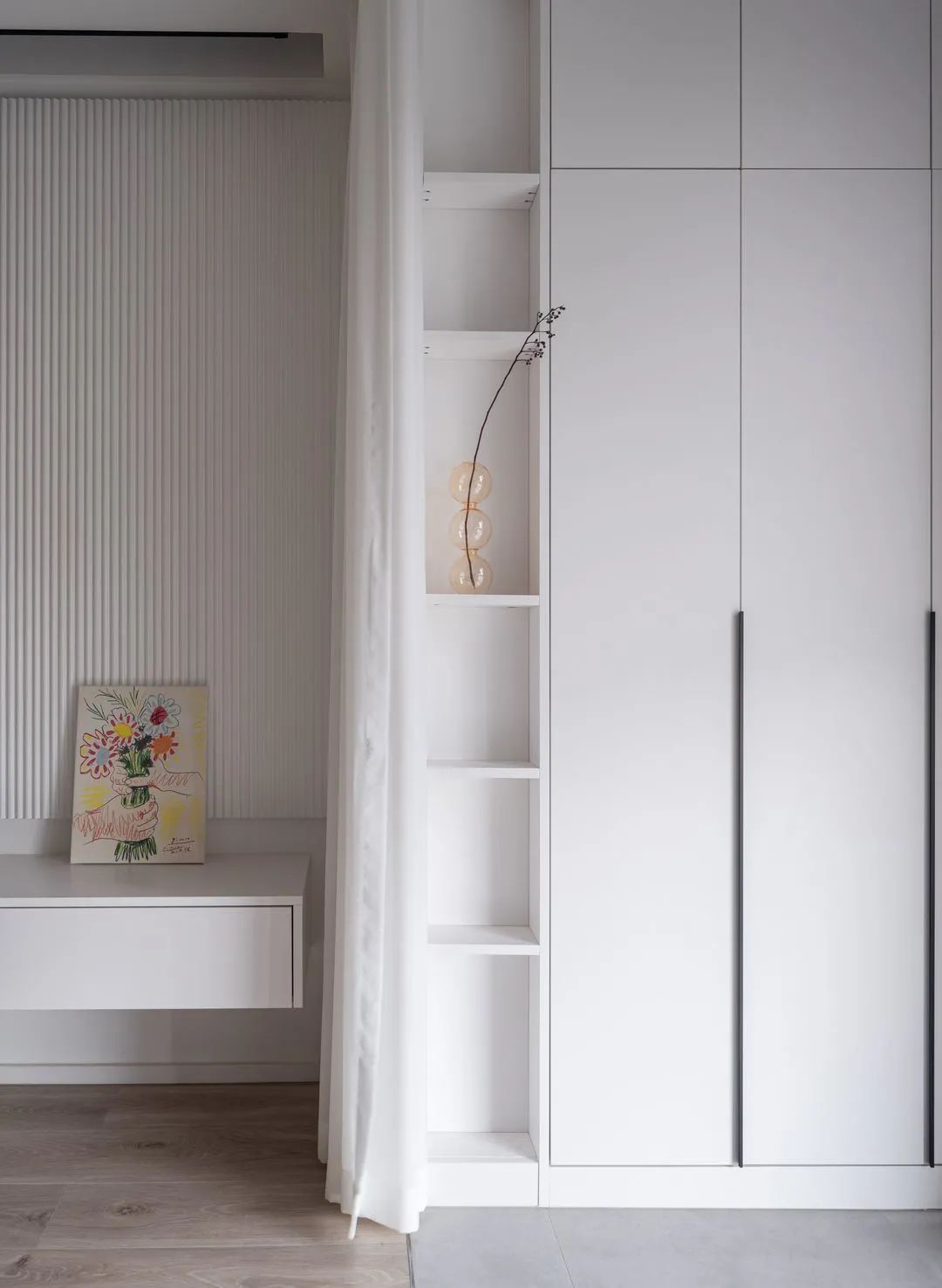 拆除了客厅与阳台推拉门,改用窗帘做隔断,让空间更灵活通透。利用阳台内凹的结构,定制了储物柜,封闭式与开放式结合,不呆板收纳也轻松。