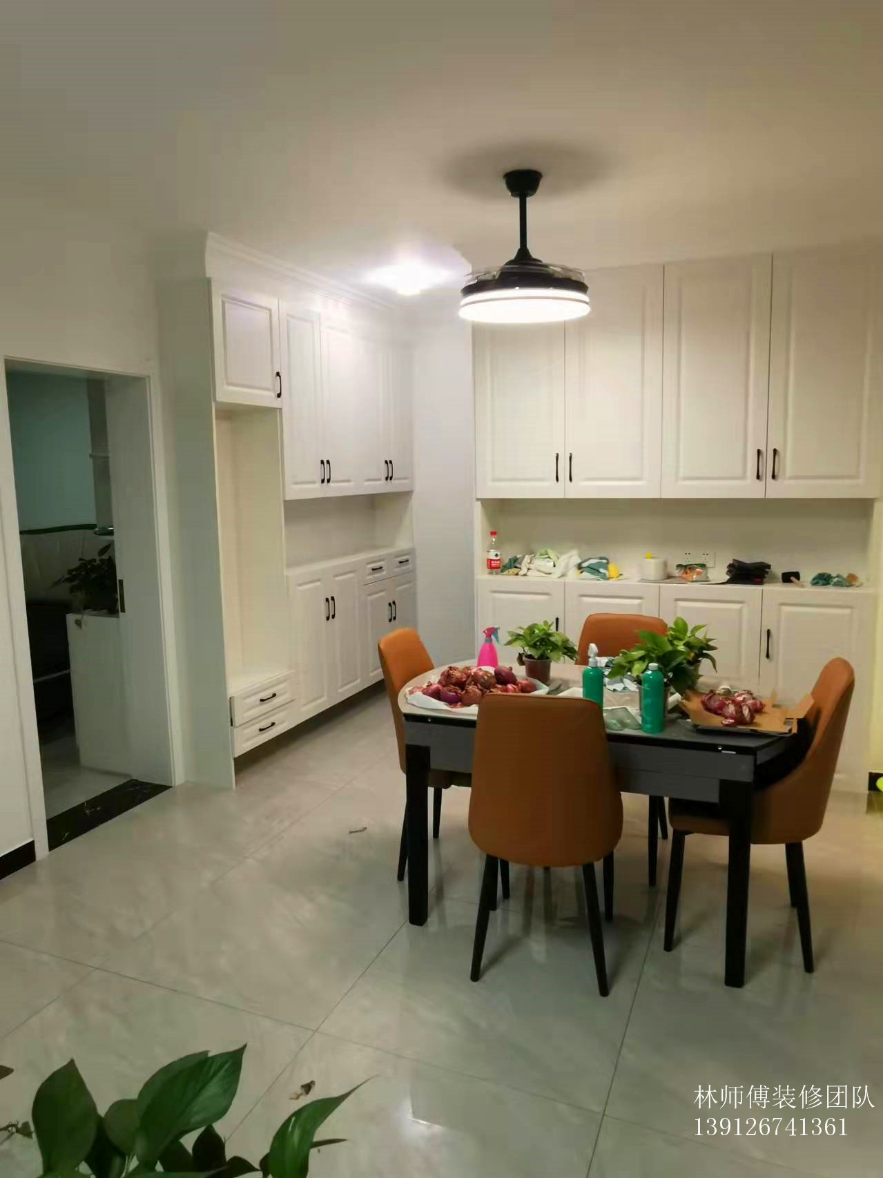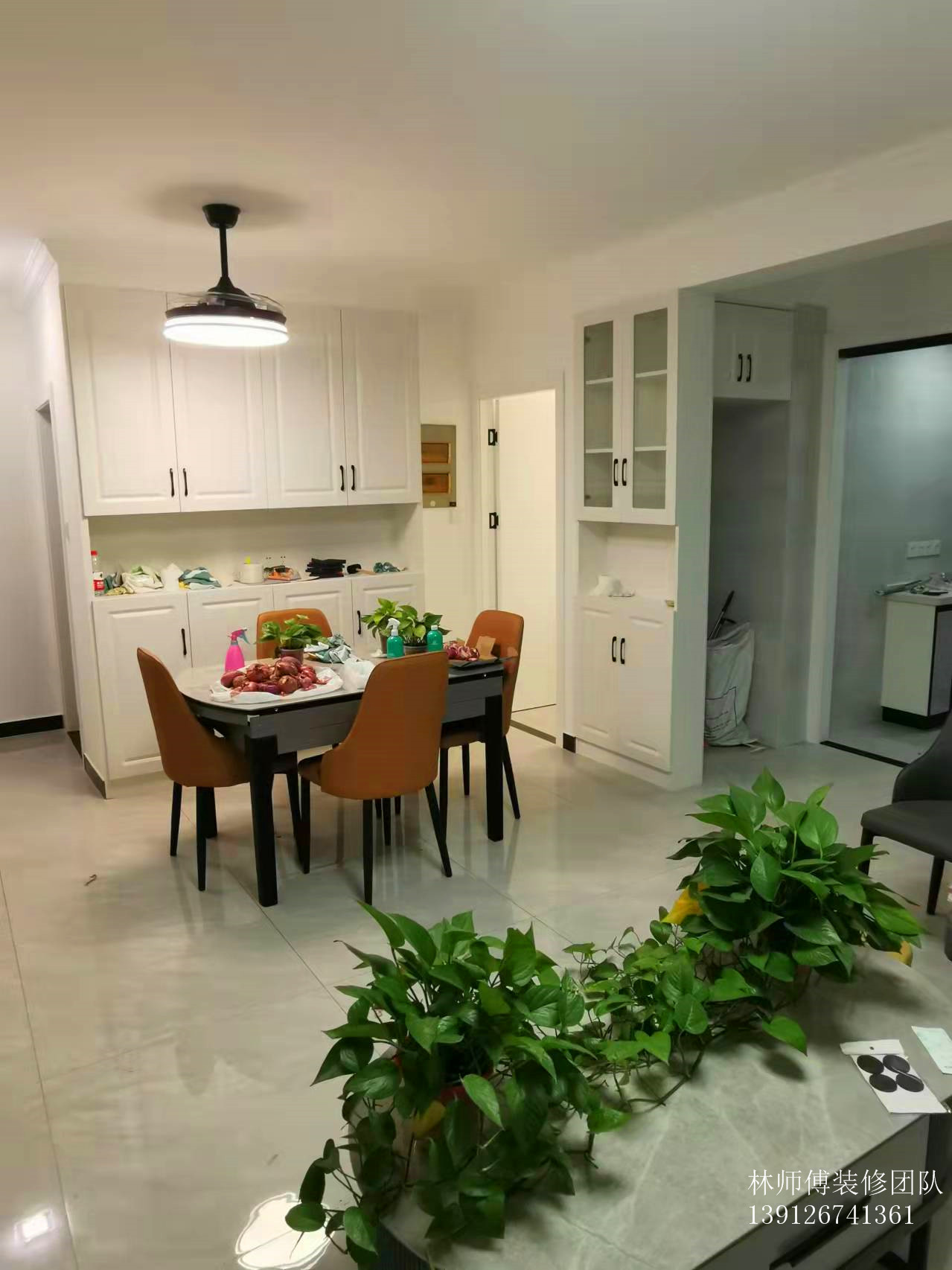 进门后先是餐厅区域,餐厅的两边都做了橱柜辅助收纳。餐桌是可以抽拉的,如果有客人来,还可以拉出来作为圆桌使用,餐厅选用了风扇灯也是非常实用的。