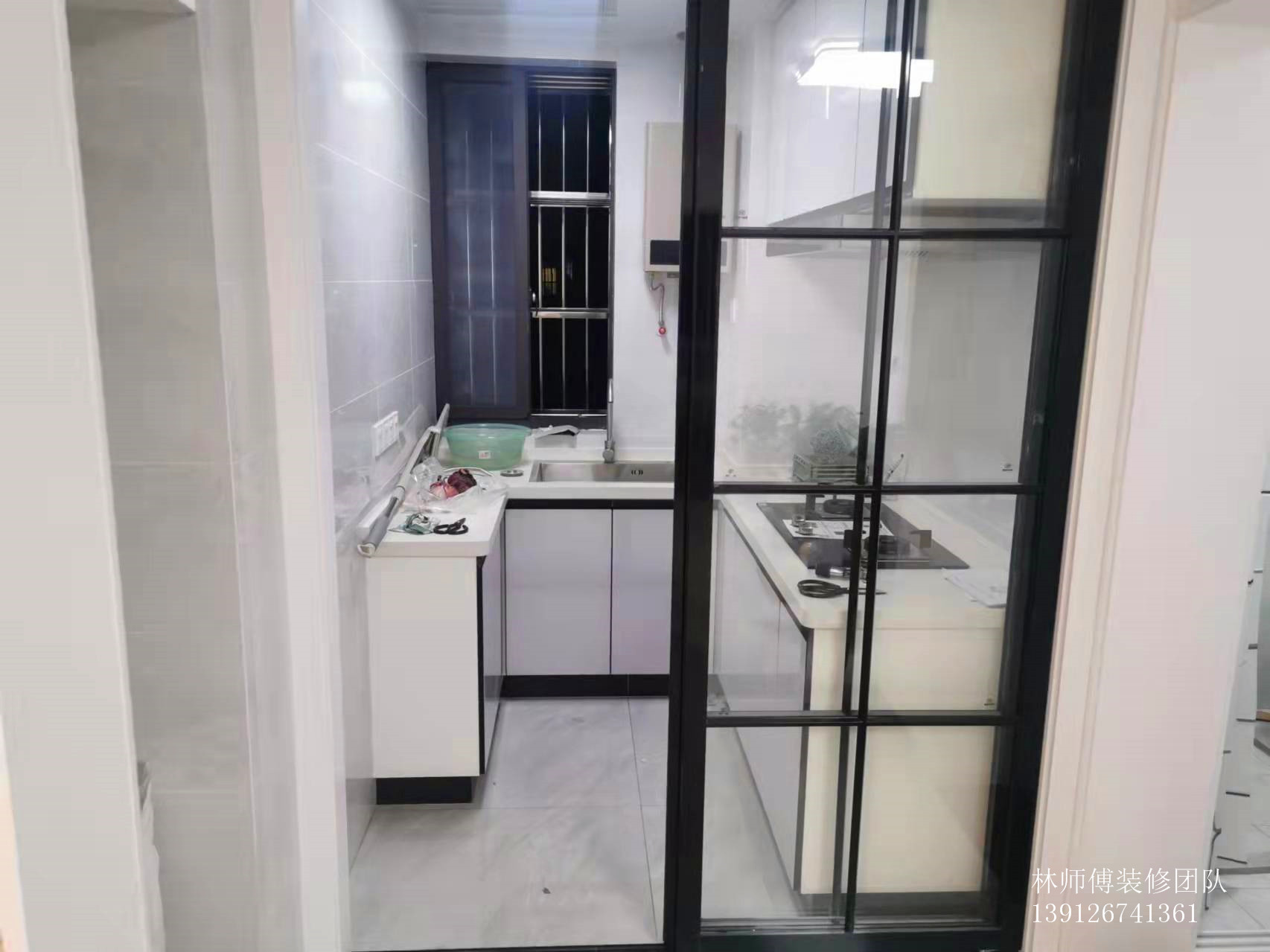 U型厨房,收纳能力强。整体以白色为主,清爽干净。厨房有窗户,采光非常好,而且玻璃移门,能让光线轻松通过,让整个厨房看起来都非常敞亮。