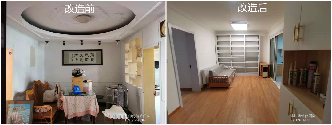 原来的客餐厅,东西摆放没有章程,让原本就不大的空间看起来更加拥挤,而且厚重的吊顶看起来也非常压抑。