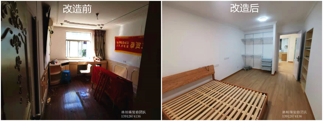原本的主卧也是老式装修,土黄色的护墙板,老气又沉闷。改造后就不一样了,白色乳胶漆,让整个房间看起来都亮堂了不少,再加上原木色的地板和床,宜居感非常强。主卧同样也是做了开放式的衣柜,每天穿什么衣服一眼就能看到。