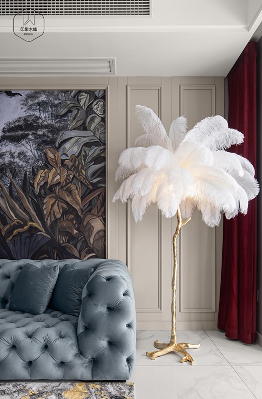 层次丰富的线条、细致立体的壁画在沙发背景中间有序地呈现着,一笔笔勾勒起空间摩登时尚的气质。经典的蓝色拉扣丝绒沙发,带你一秒梦回巴黎,灵动的羽毛落地灯,酒红色的窗帘,一种法式电影般的场景在此油然而生。