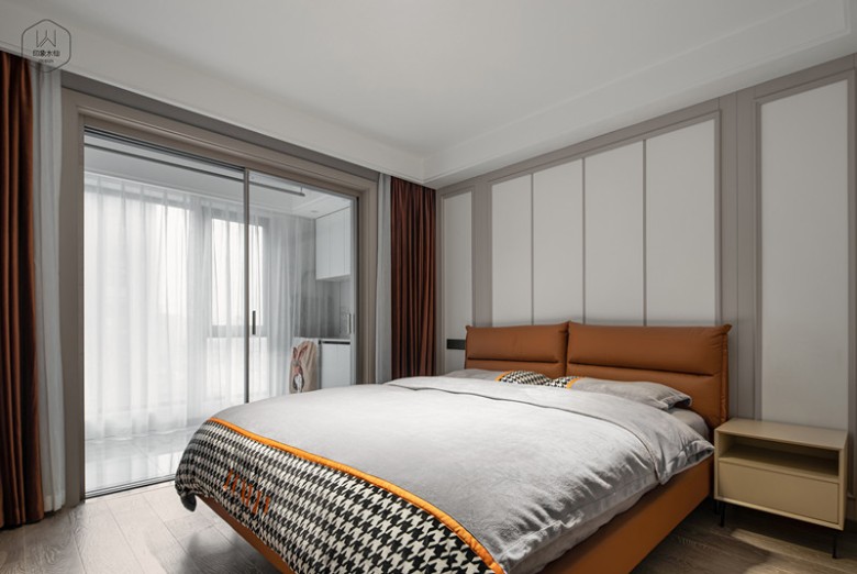 次卧Second bedroom 浅色系拼色整木护墙散发简约美,橘色双人床和同色系窗帘是整个空间的视觉焦点,浅灰色拼千鸟格床饰彰显着业主的生活品味。 次卧Second bedroom