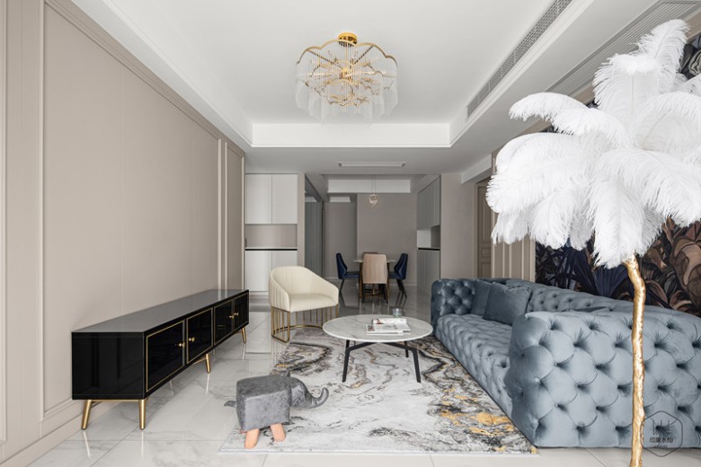 步入客厅,一眼被这高级的配色所惊艳,流畅的水晶吊灯,让纯碎的白色顶面迸发出艺术的灵感。