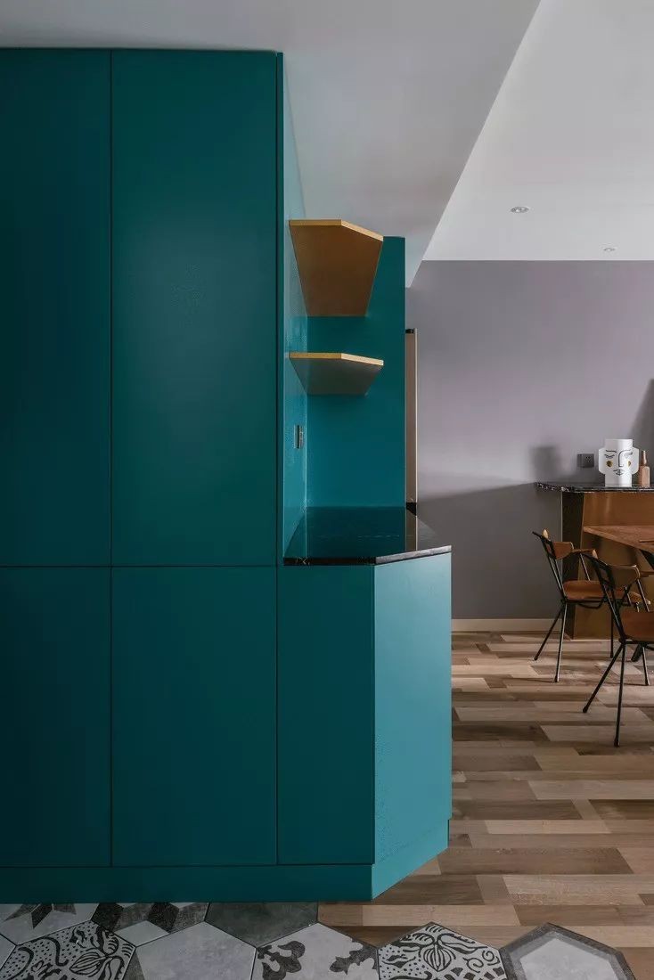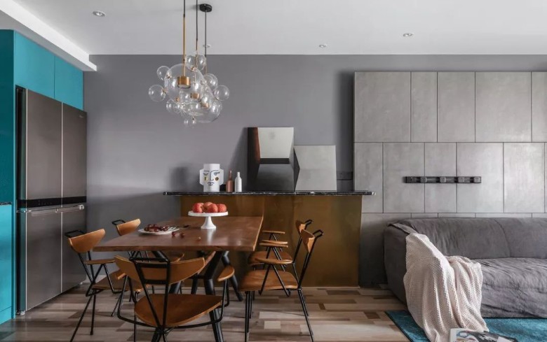 今天分享的是一套建筑面积84平米的混搭风小户型二居室案例,房子面积不算很宽敞,但屋主在装修上花了很多心思。沙发背景墙、床头背景墙加上色彩的碰撞,打造出这样一个精致、大方的小户型空间,让人羡慕不已。 入户的玄关走廊,地面铺设了六边花砖,墙面做了到顶柜子,柜子延伸到餐厅处,转角处做出开放式的搁架,方便摆放零碎物品。 餐厅和客厅连在一起没有做隔断,冰箱被嵌入了餐边柜当中,侧方还有一个小隔板桌,摆放各种装饰品,木质与铁艺集合的餐桌椅,精致大方。 整个客餐厅是以灰色作为主色调,各种不同层次的灰色搭配白色和木色,营造一个年轻大方而又宽敞舒适的空间。 沙发背景墙的上做了独特的水泥质感的造型,深灰色的布艺沙发、窗帘搭配孔雀蓝地毯、金属制茶几,营造出一个优雅、轻奢风的客厅空间。 从客厅看往玄关,电视背景墙上是突出显示了一部分的灰色造型,客餐厅的木地板和玄关、厨房的六边砖形成明显的空间划分。 厨房内部的空间比较宽敞,L型的橱柜布局搭配一侧的洞洞板收纳,地面的六边花砖和白色的长条砖结合,构造一个自然、大方的烹饪空间。 卧室的床头背景墙设计也非常有创意,水墨画质感的墙纸和圆形装饰画、木质斜边造型结合起来,让人感觉非常有档次。一侧床头柜改成了梳妆台,更加实用。 另一侧的床头柜上方垂下一个简约吊灯, 加上了金属元素之后,更加精致。衣柜和床品、床头柜都选择了相同色系,显得更加整体,又有层次感。 儿童房内摆放一张高低床,卡通款式的床让孩子更加喜欢,底部留空的淡蓝色衣柜满足孩子的不同收纳需求,也和主卧衣柜相互呼应。 干湿分离的卫生间同样以灰色作为主色调,在镜柜的上下方都加上了灯带的设计,镜柜也做了延长的款式,让卫生间看起来更加宽敞明亮。