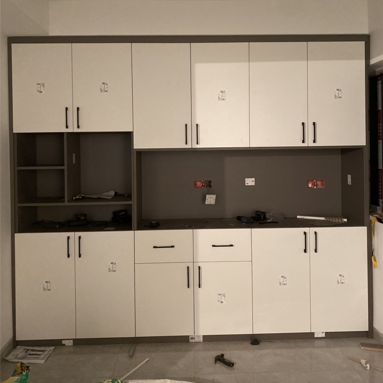 厨房是旧橱柜拆下来重新安装的,看安装后还是很好的。但是细看用了三年的柜子还是有点脏,油不拉几的。师傅吐槽他一手油污