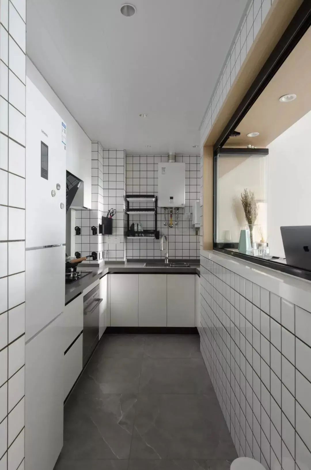 进门左手边便是厨房,狭长空间做L型厨柜,利用短边做水槽,厨房使用起来也更加方便。
