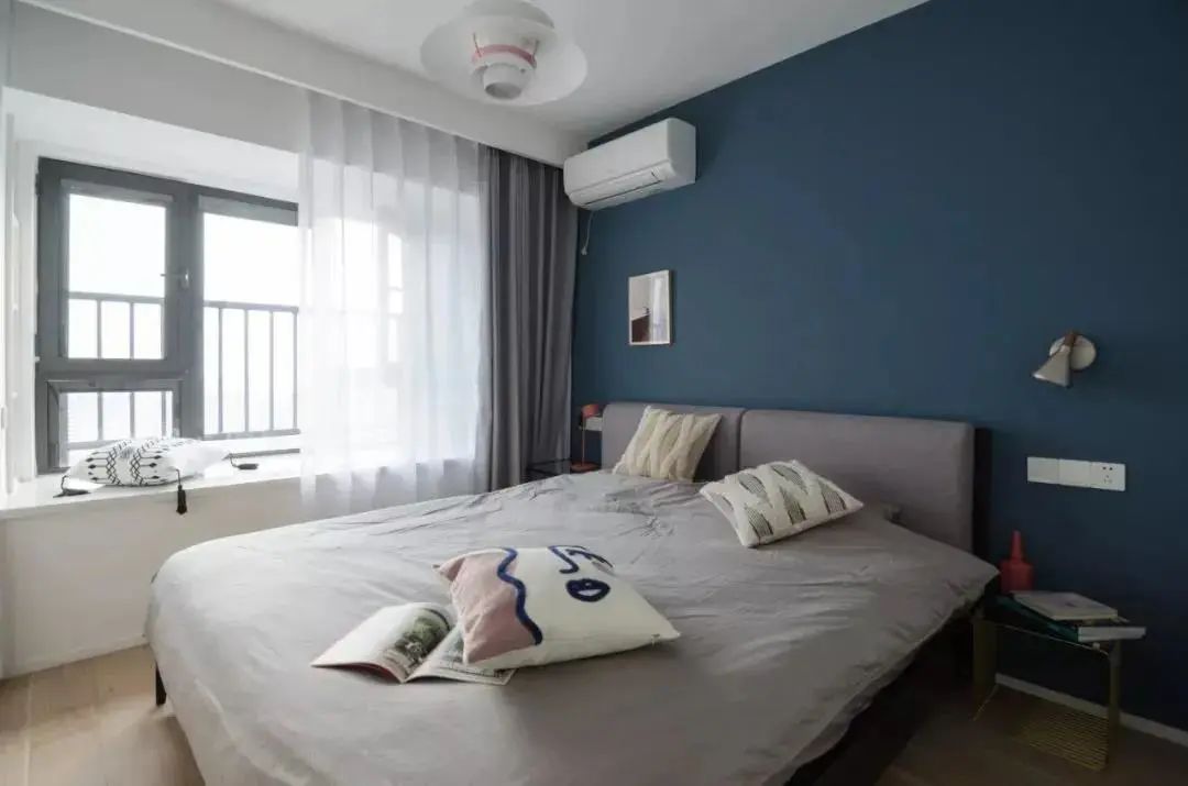 主卧室床头涂刷了逆光深爱的蓝色,到顶的推拉式衣柜,最大程度利用了空间。