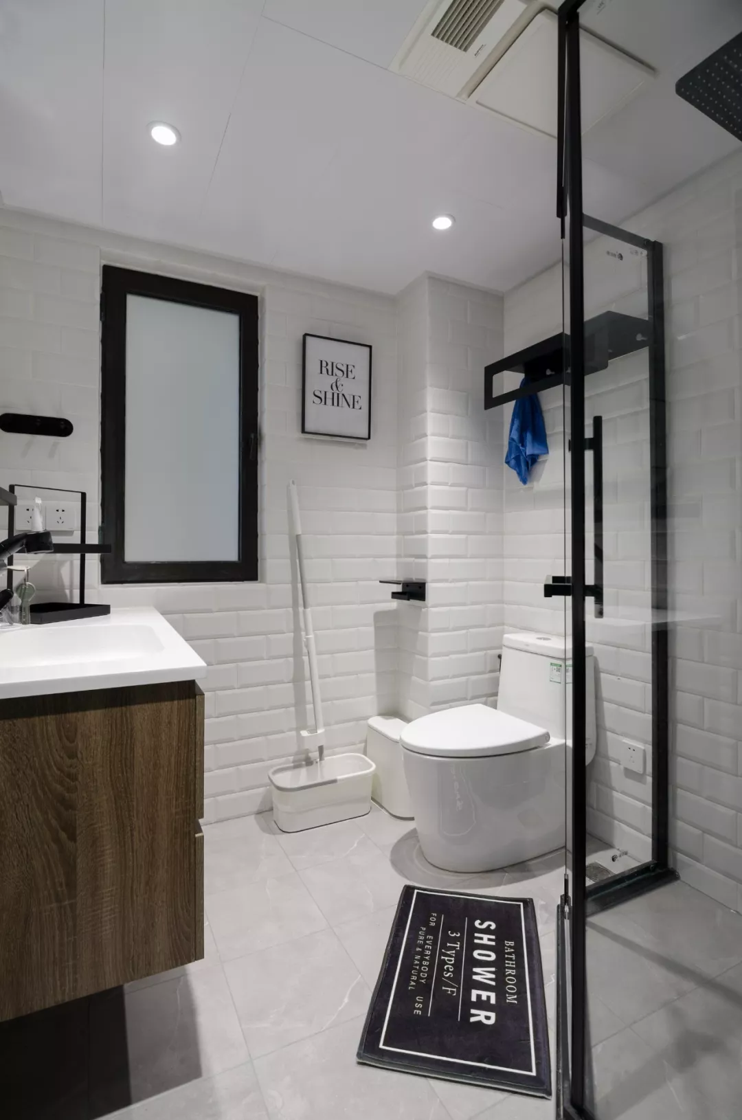 卫生间用了素雅的白色面包砖,搭配黑色五金非常耐看。