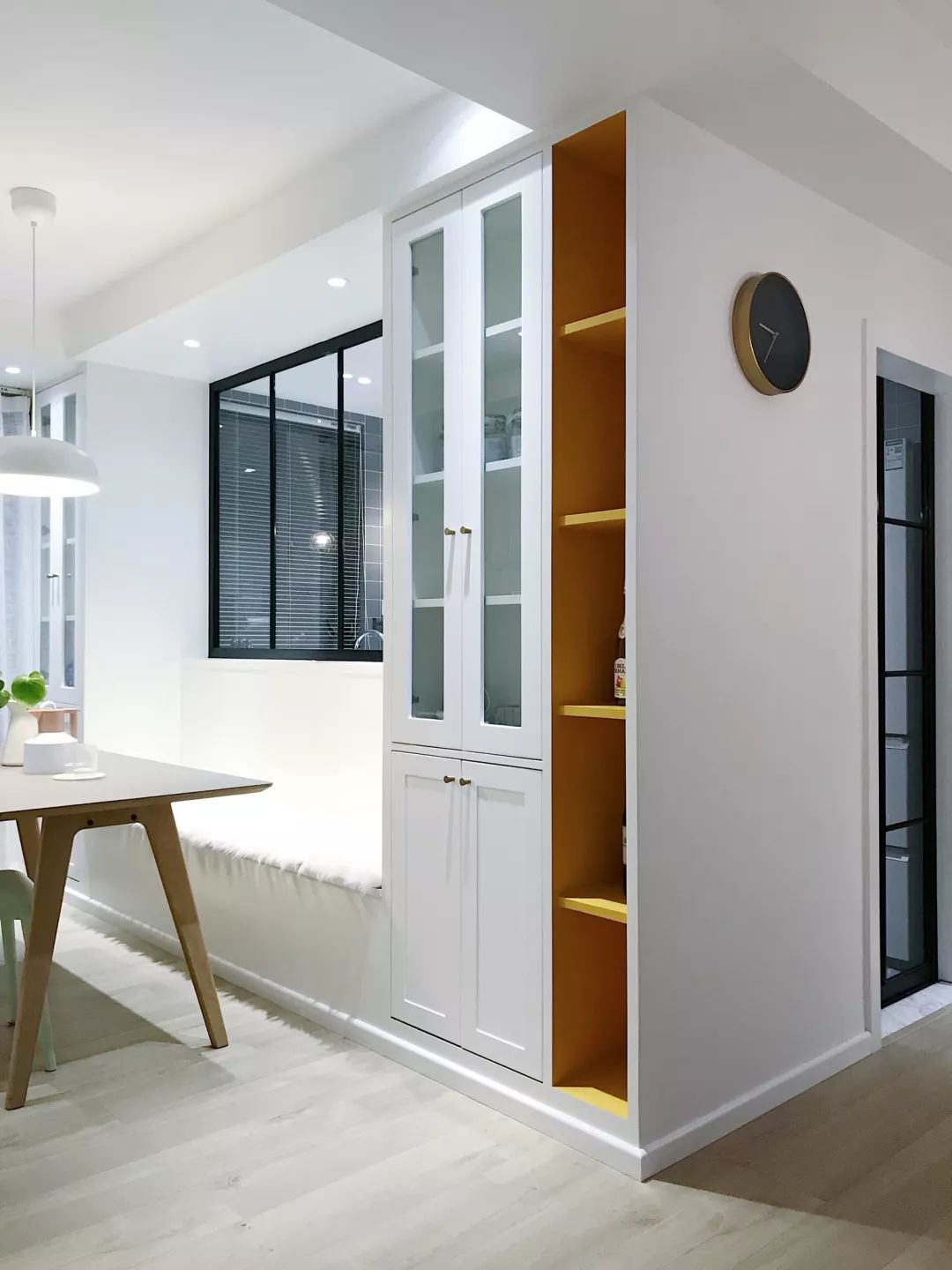 玄关走廊的另一侧就是厨房和餐厅空间,连着嵌入式柜子的卡座非常省空间和实用。厨房和餐厅之间用黑框玻璃作为隔断,非常漂亮。