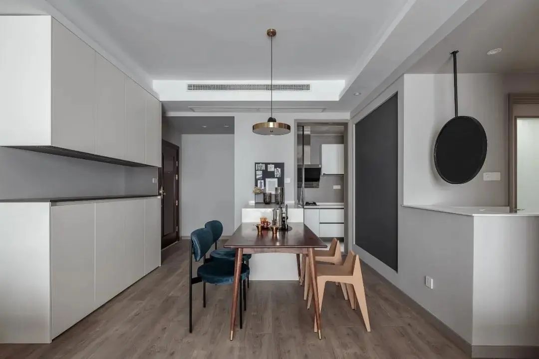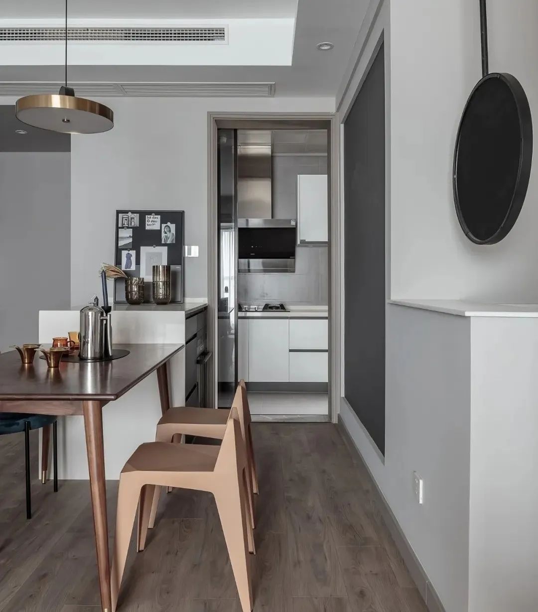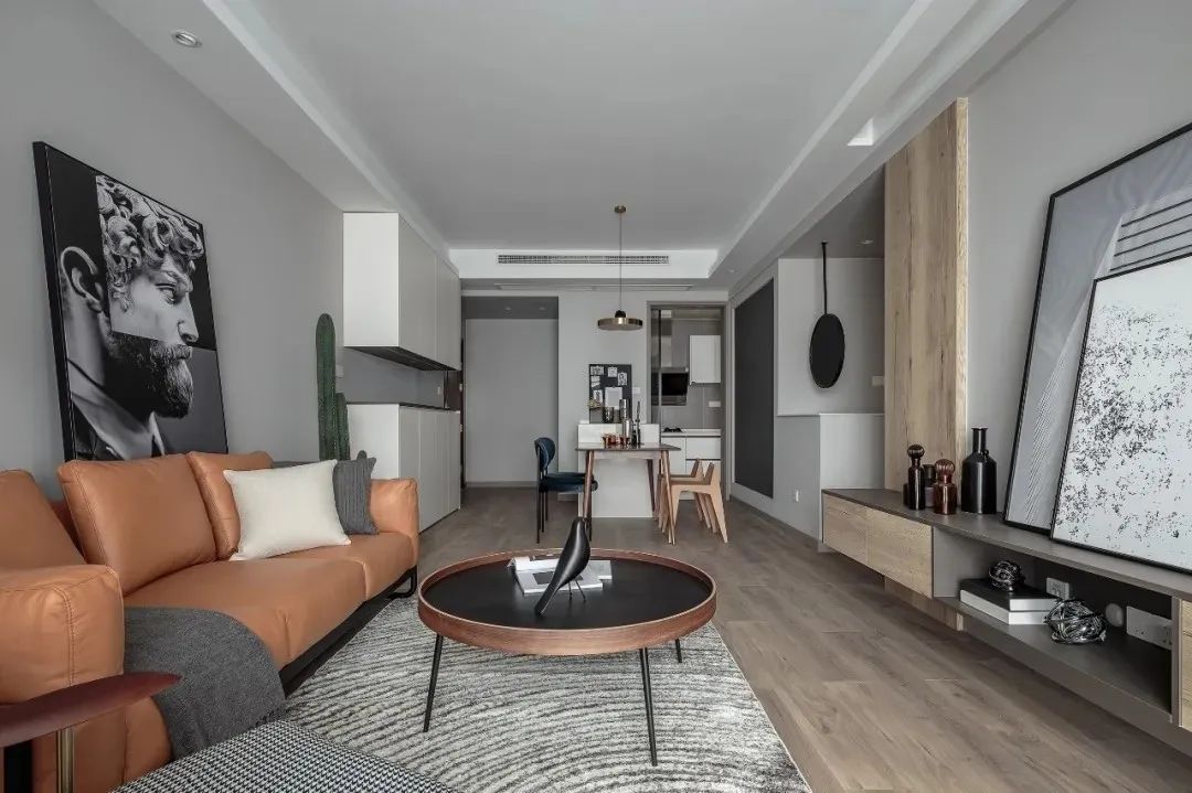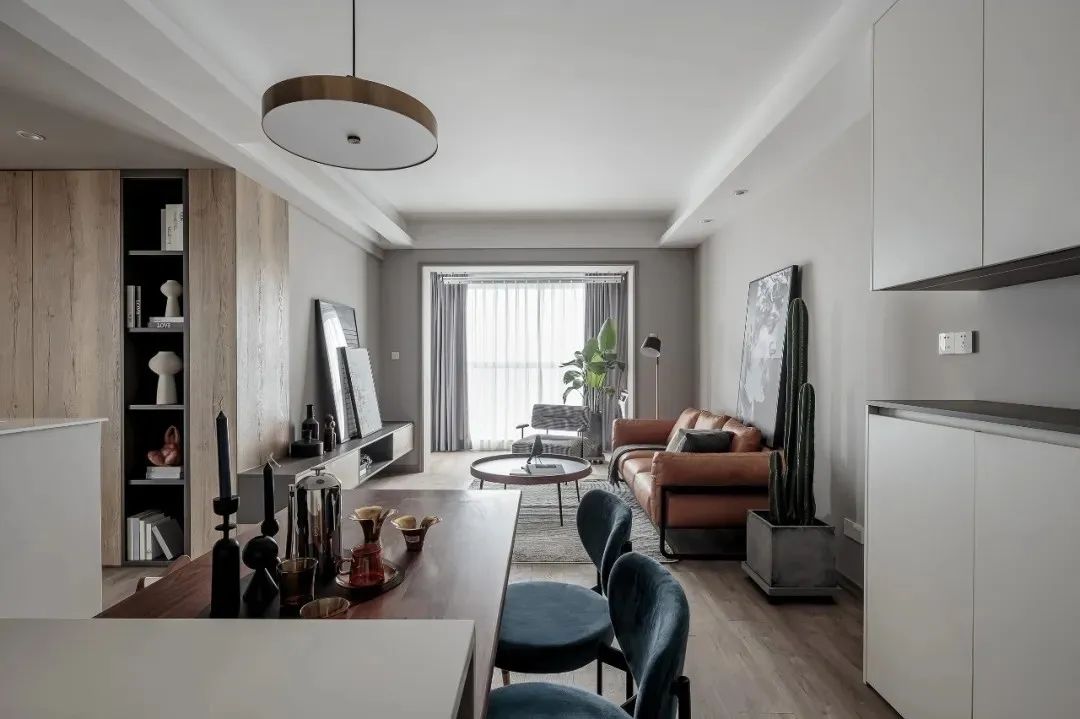 客餐厅直接没有明显分界,一体化的设计,整体上的色调是高级灰加原木风的混搭设计。细腿的圆形茶搭配皮质沙发,简洁又和谐。