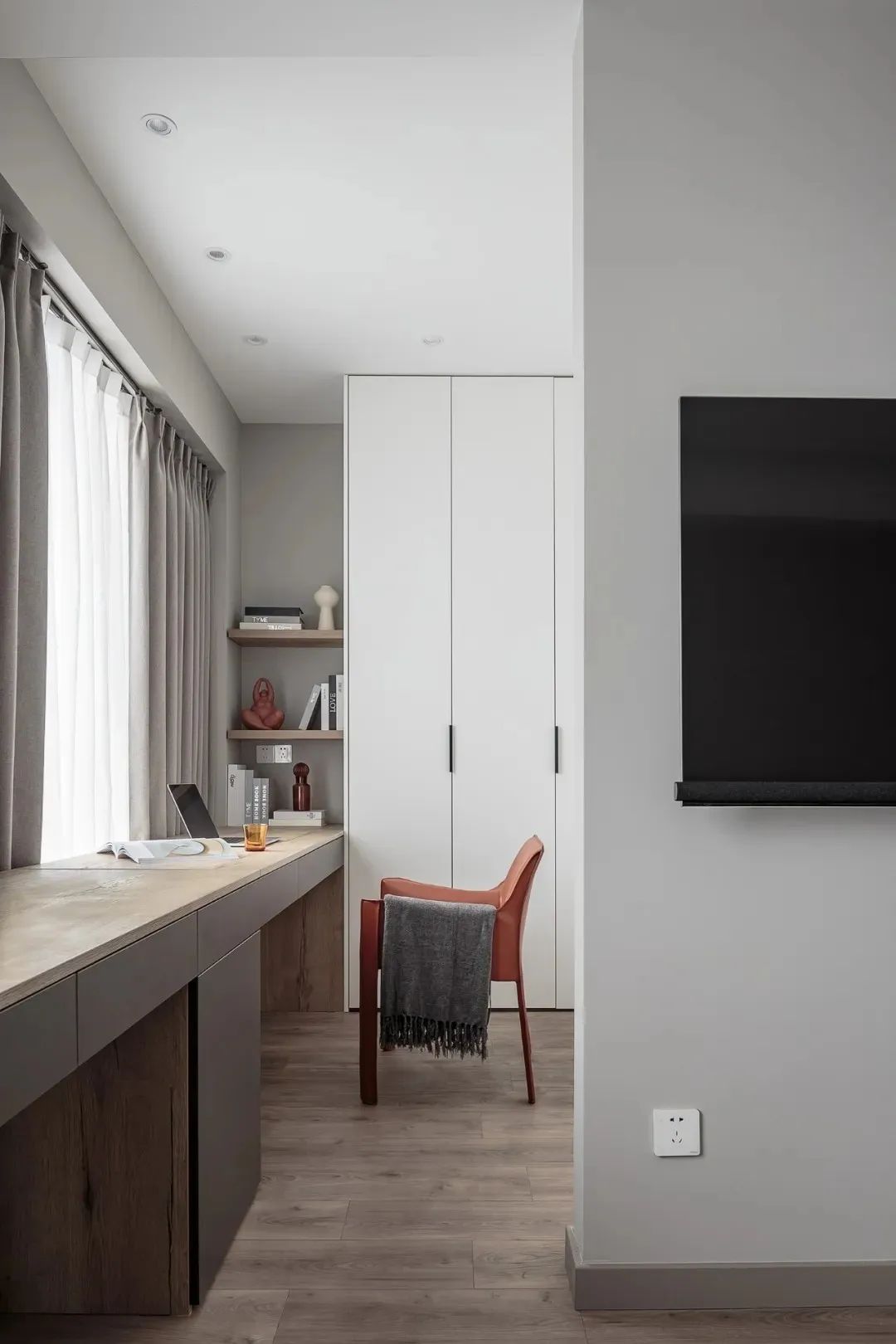 飘窗延续床头的原木风设计,通过木质板面使飘窗、书桌、衣帽间、梳妆台整体贯通,衣帽间收纳柜靠墙设立呈L型,用储物柜代替墙体划分出区域,衣柜与书桌的夹角利用层板形成女主人化妆区的储物空间。