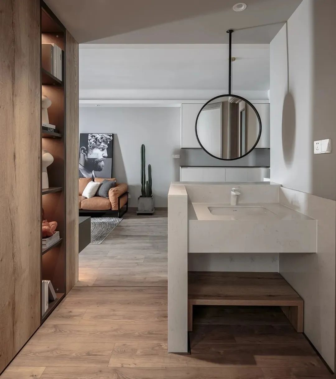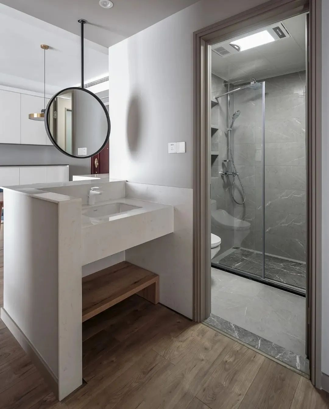 卫生间改造成干湿分离,把洗漱台外移出来做成开放式,作干区使用,缩短了用餐时洗手的动线。