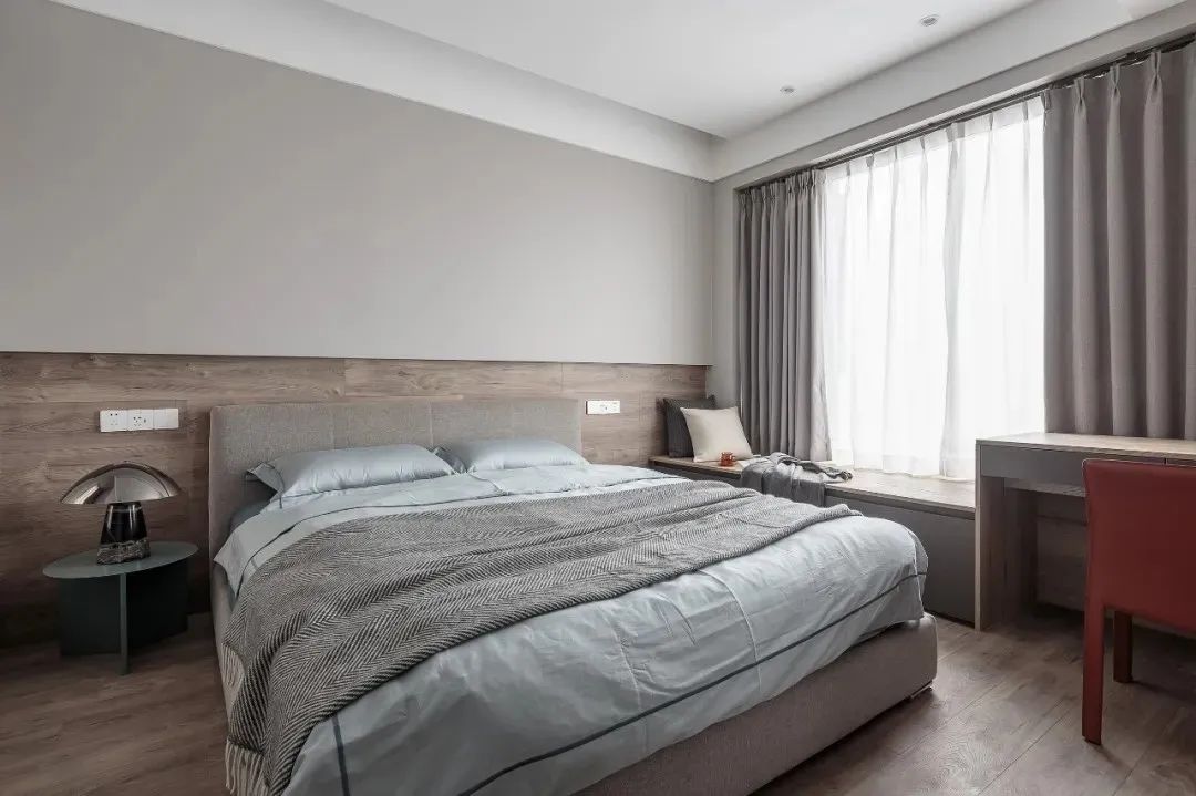 设计师把主卧室的一面非承重墙打掉,增大了空间面积,床头背景墙设计半墙原木式设计,空间感整体拉长。