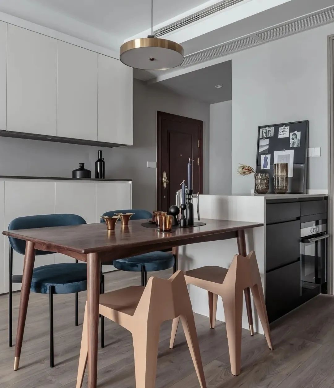 进门左手边便是餐厅,空间狭小,餐桌与外设岛台结合,岛台内设计嵌入式烤箱,减少了厨房负担。木质餐桌、丝绒椅、大理石岛台、金属吊灯,这些不同材质与颜色的混搭,尽显和谐,又极具个人风格。