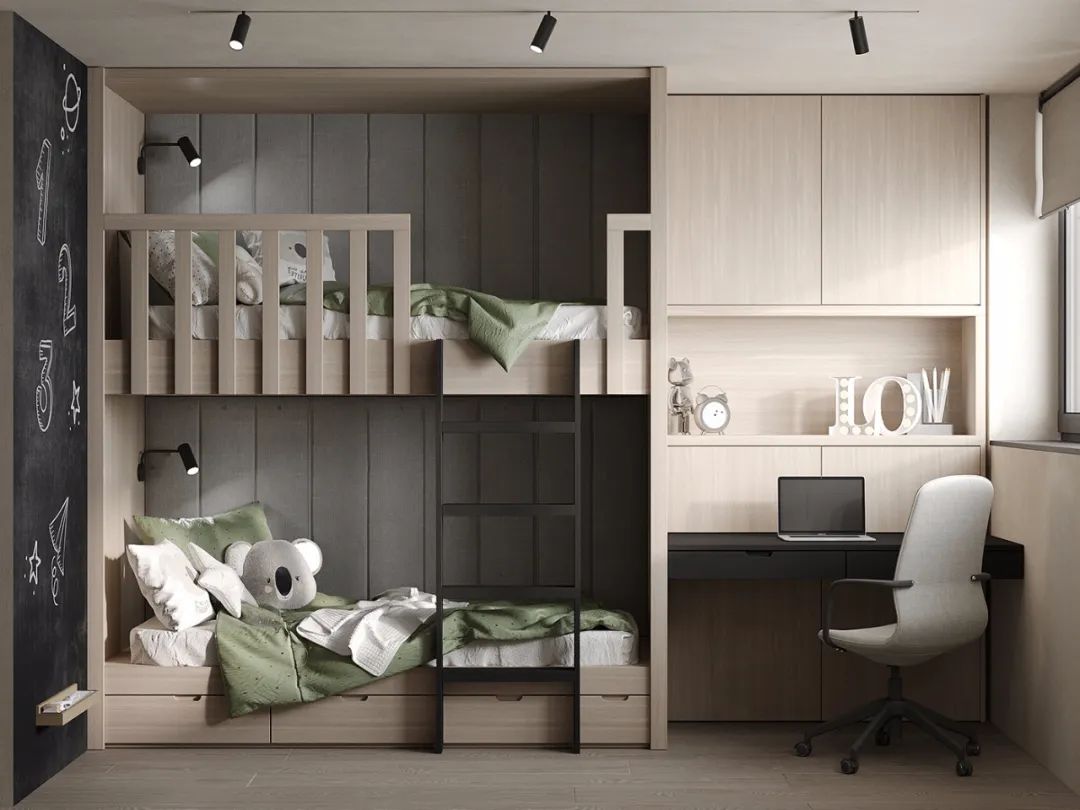 但是儿童房所用的高低床,其外观造型,所包含的功能,以及在安全的保护上要更优于传统宿舍的上下床。