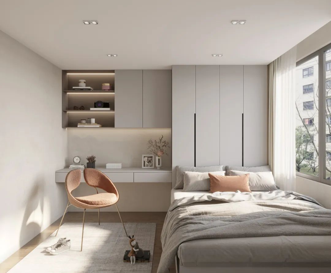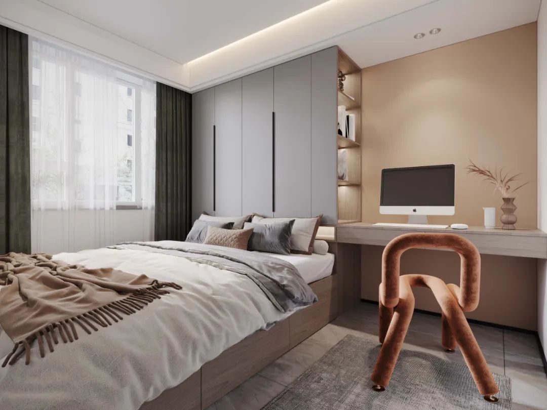 国内的榻榻米和日本的榻榻米完全是两个概念,国内的榻榻米,基本都是在窗边沿着开间方向铺设地柜,在其上面布置床品。开间尺度足够的话,在地柜靠两侧墙体位置可以打柜子,既能满足睡眠功能,还可以制造更充足丰富的收纳空间。