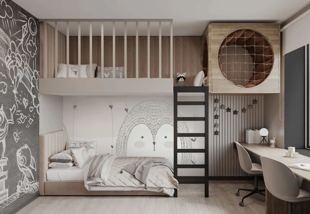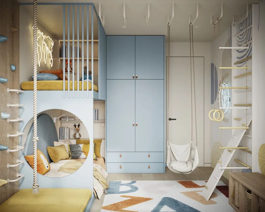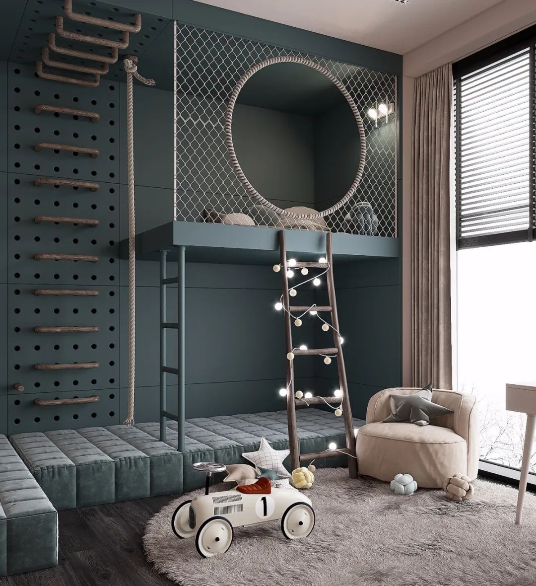 02. 小孩子是非常好动的,喜欢爬来爬去,上窜下跳,而高低床的设置,就好比树屋,符合孩子的天性,充满趣味性。