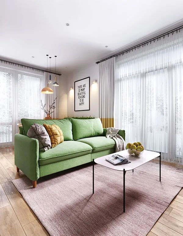 ▲现代简约的客厅,在木地板的基础,沙发区域垫上一席灰粉色的地毯,摆上一套草绿色的布艺沙发,大理石材质的椭圆茶几,整个布置充满简约清新的气息。