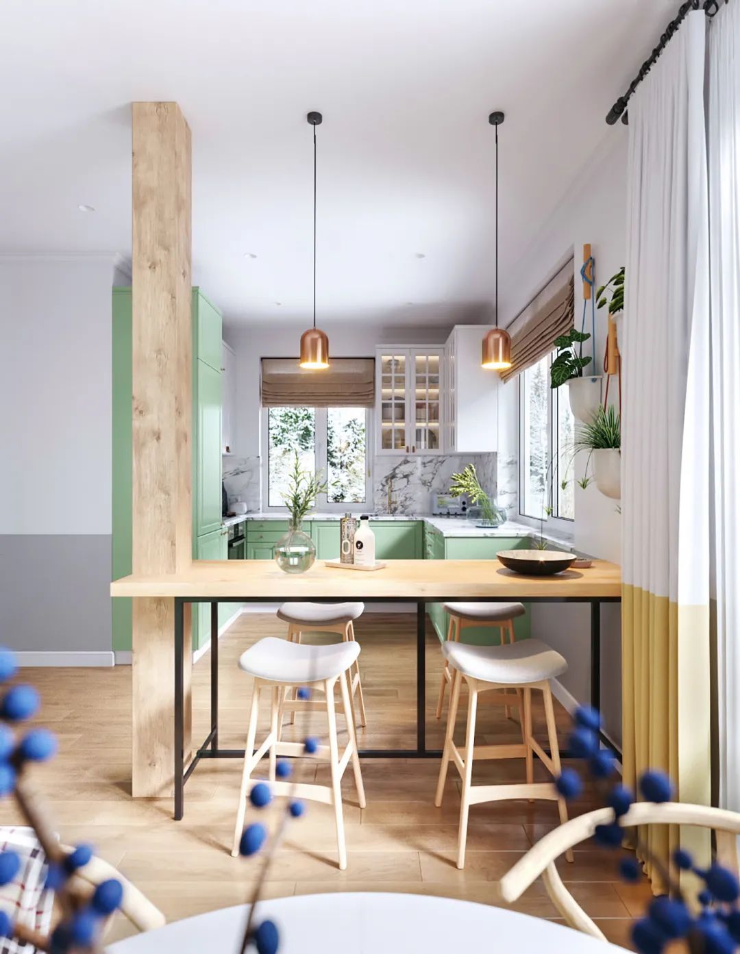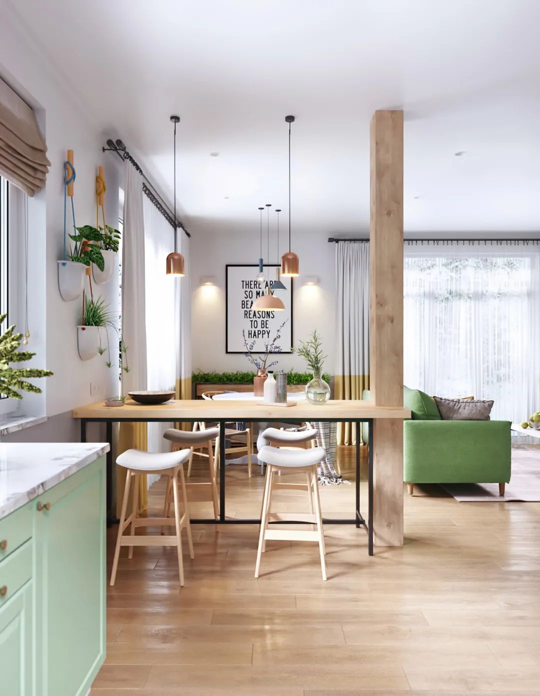 ▲长圆餐桌旁边,挨着柱子定制一张吧台式餐桌,布置高高的吧椅,吧台与墙上都加入了绿植的装饰,也是显得更加清新文艺而有趣。
