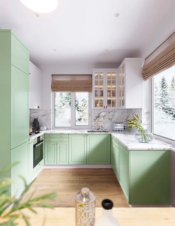▲厨房的橱柜也是草绿色的,装上白色吊柜,吊柜还带有玻璃门的设计,整体显得更加实用而情趣。