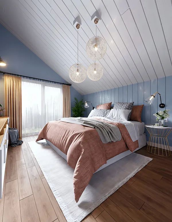 ▲在浅木色木地板+蓝色调墙面的空间氛围下,天花装上几盏球形的编织灯具,床单粉色+褐色的组合,也是增加了空间的优雅与端庄气质。