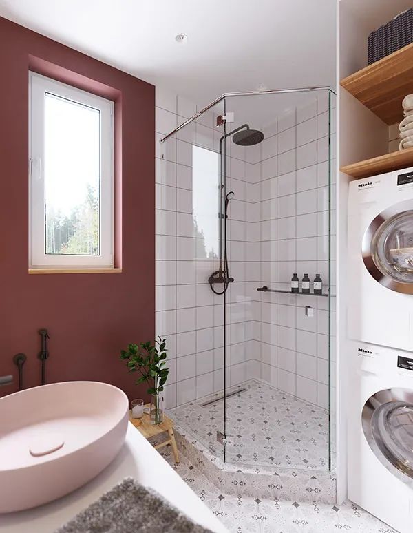 ▲卫生间地面是花砖,淋浴房的墙砖是白色小砖,而淋浴房外的空间则是褐色的空间,洗衣机与烘干机都摆放在卫生间里面,整体显得实用而又情趣自然。