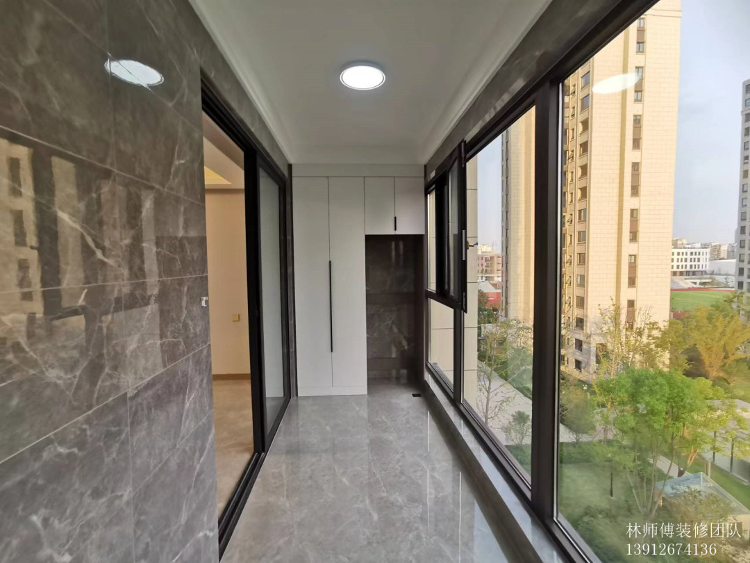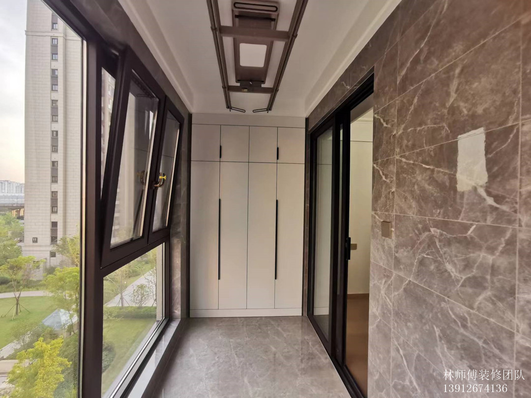 双阳台,面积比较大,落地窗也非常漂亮,采光充足。为了不浪费空间,阳台的的两边都做了橱柜,辅助家里的收纳,日后洗烘机嵌入橱柜,整体统一还美观!