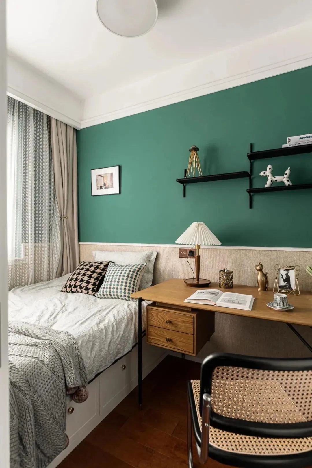 横向拼色一般可以分为二分法和三分法两种,二等分法是横向拼接中最简单的一种拼色方式,只需一款有色墙漆+白墙即可完成。将墙面等分上色,也很符合现下复古风,两种颜色搭配既不单调,又不花哨,为整个空间构建出一种鲜明的对称美。