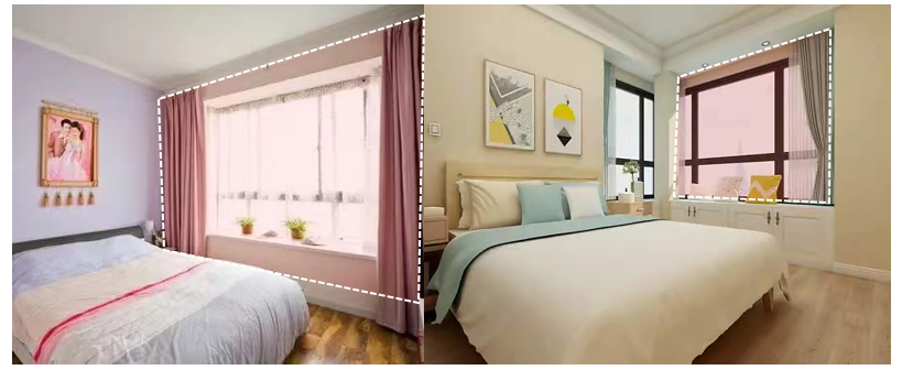 ▲左边是窗帘装在外面的效果,右边是装到里面的效果