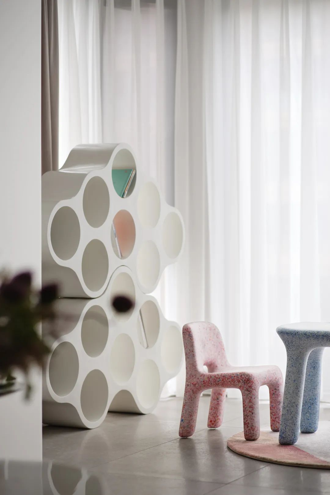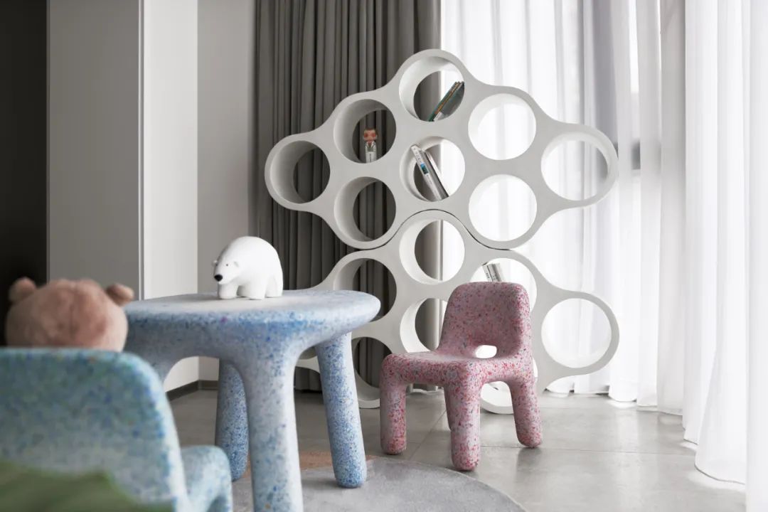 可爱圆润的儿童桌椅色调自然清新,创意蜂巢书架也极具趣味性。