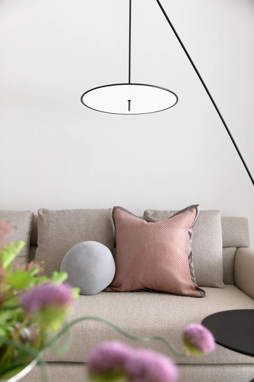设计师通过色彩测试发现女屋主喜好舒缓精致的粉色,因此将粉色元素灵活点缀在客厅,营造出温馨的居住氛围。