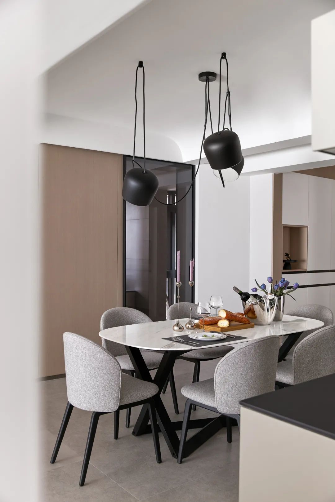 餐厅与厨房之间安装窄边推拉门,两个区域隔而不断,维持空间的通透感。