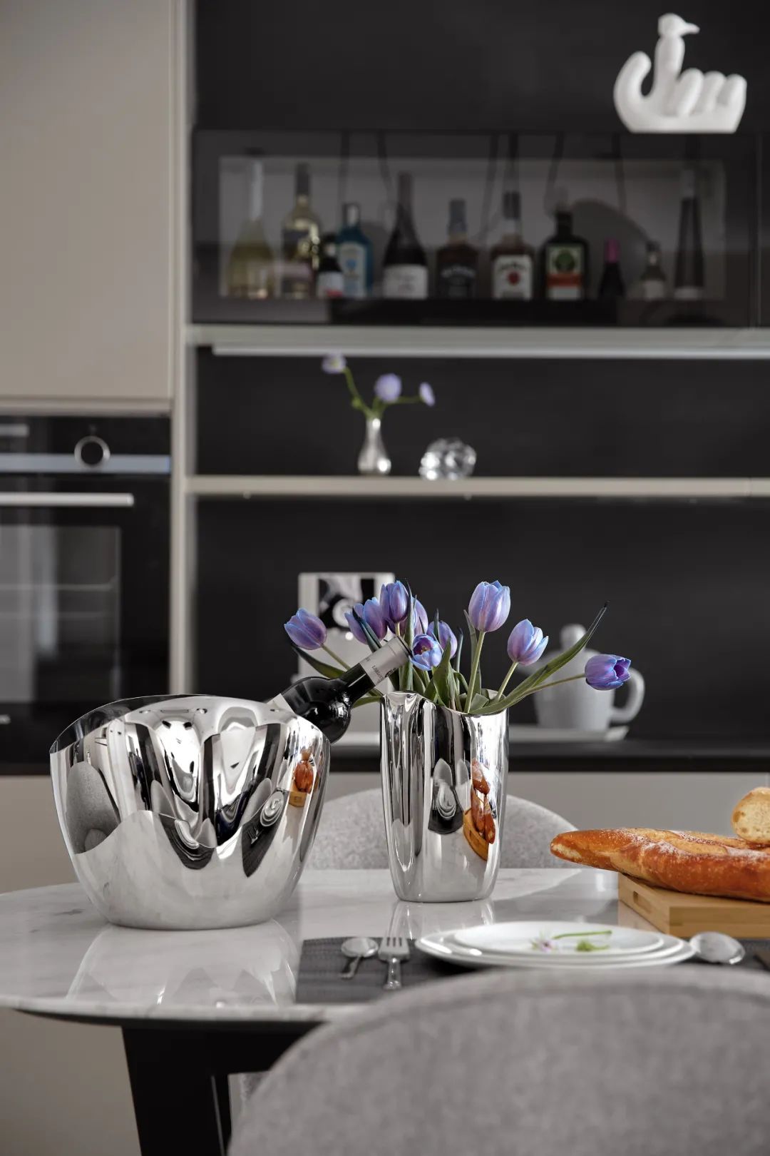 香槟桶搭配Georg Jensen的精美餐具与Robert Welch的银色花瓶,营造出的轻奢质感在餐厅流转。