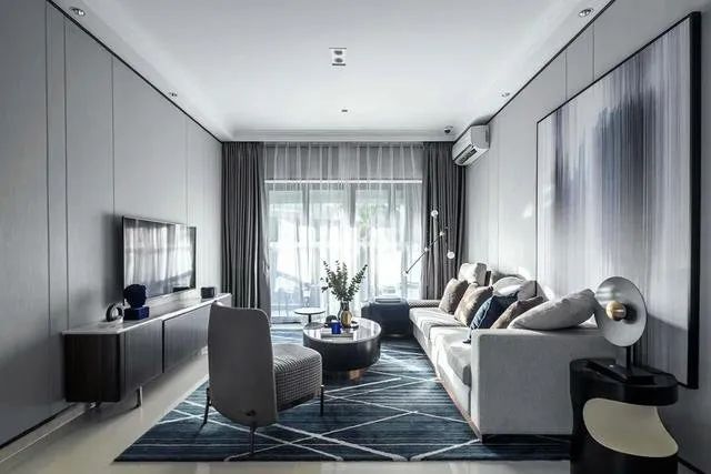 ▲客厅空间以现代大方的空间风格基础,电视墙与沙发墙都是以灰色的硬包作为背景,布置上舒适大方的家具软装,让客厅空间充满优雅端庄的大气氛围感。客厅空间其实并不是宽敞,但是在现代舒适的软硬装结合下,舒适的灰色质感,让空间显得格外的高档大气。
