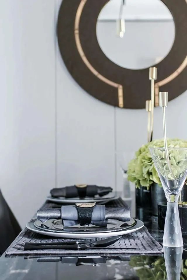 ▲餐厅也是以硬包背景墙,墙面装着独特的棕色+金属结合的装饰品,搭配上黑色石材台面的餐桌,布置端庄华丽的餐具、花瓶与小饰品,带来一种精致清新的用餐体验感。