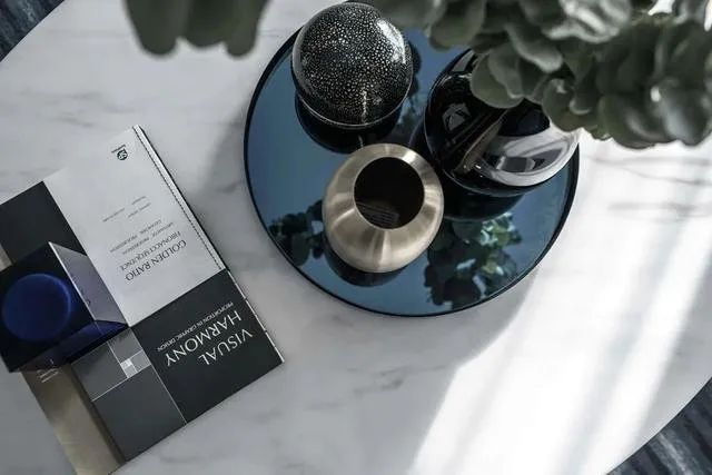 ▲茶几是圆形的大理石材质,茶几上摆上精致的花瓶与杂志饰品,茶几还有实木与金属质感的底座,华丽精致的家居软装质感,增加了空间的高级档次质感。