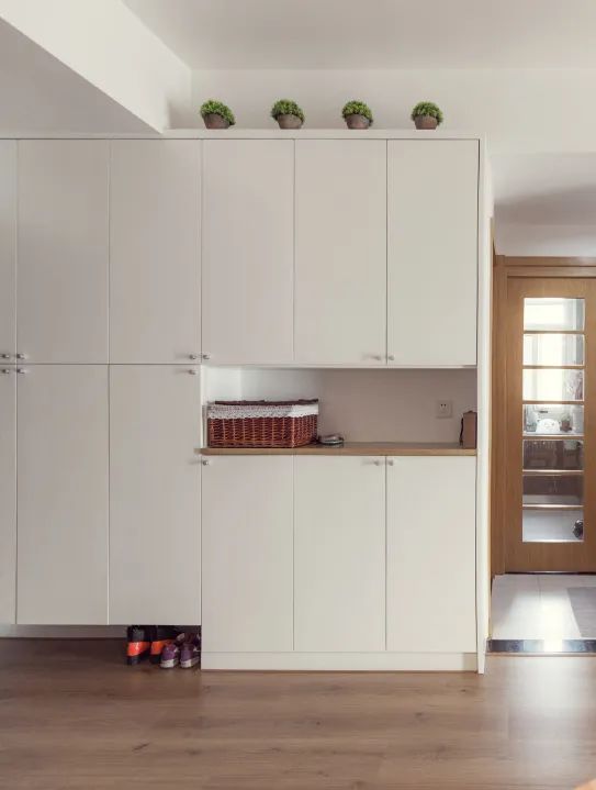 01.不要选择全封闭落地样式的玄关柜,中部或者部分柜体留空,方便放置随手物品,底部留空15cm左右,方便收纳和更换频繁穿换的鞋子。