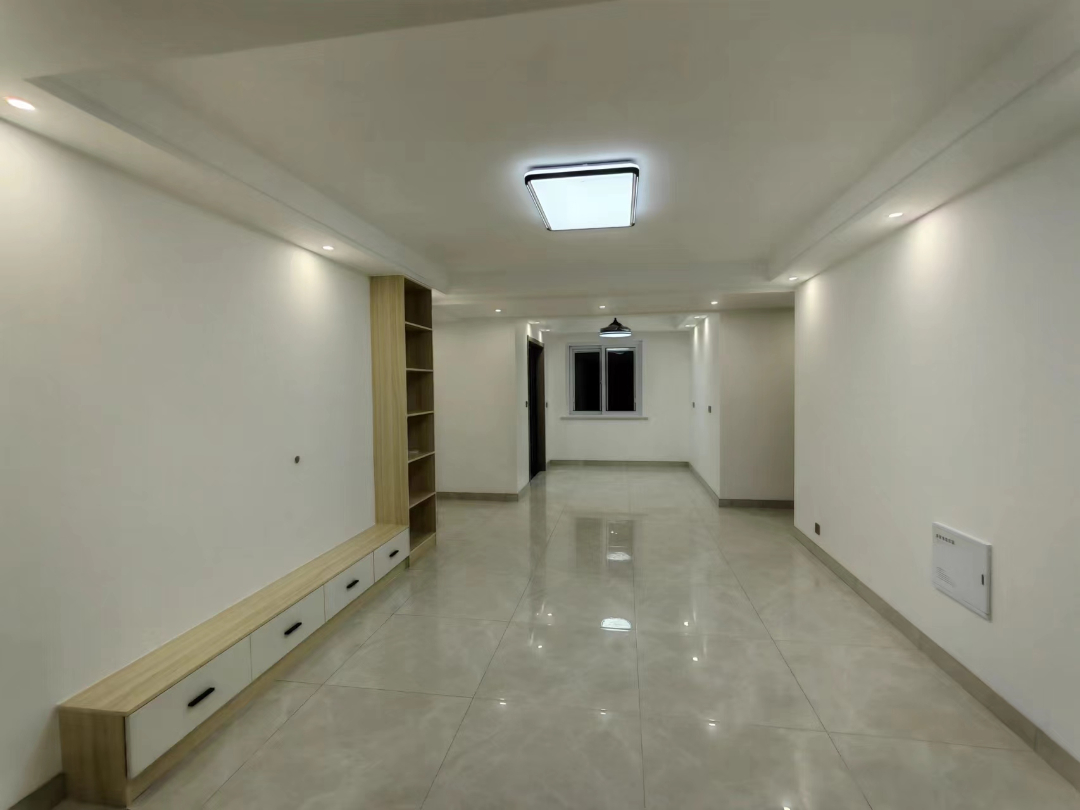 房屋南北通透,户型方正,客厅没有做任何装饰,大面积的留白也能为后期的软装带来更多的设计可能性,轻硬装重软装,才是王道。电视柜做了一个L型的收纳柜,平时用来收纳足够了。