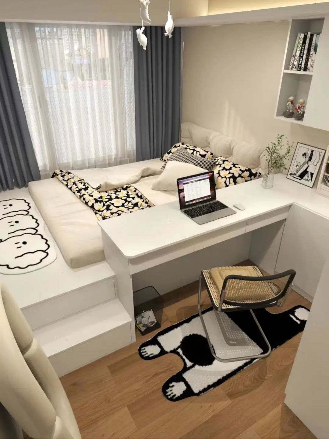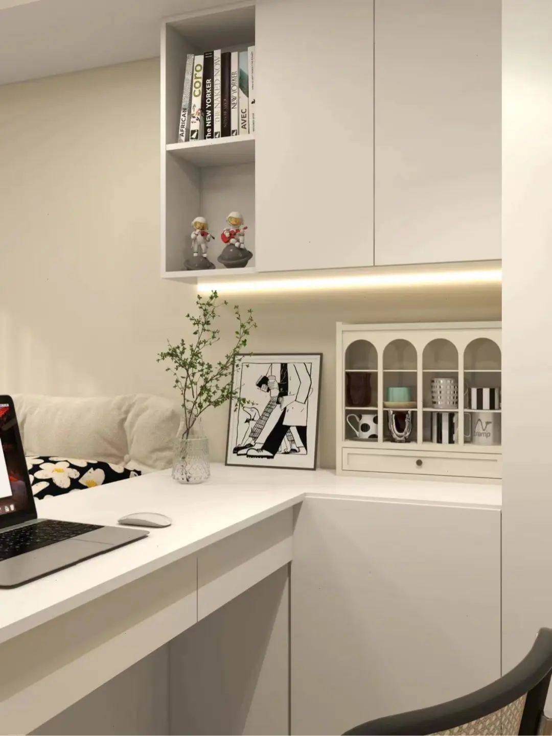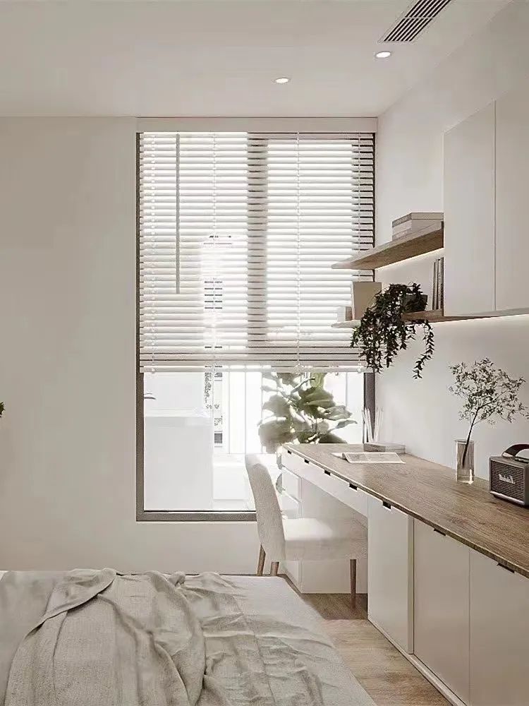 另一侧窗边靠墙加入悬浮书桌+书架,解锁一个办公角。整屋的悬浮设计,将空间高级感拉满,保持了视线畅通,视野开阔尽显大气。